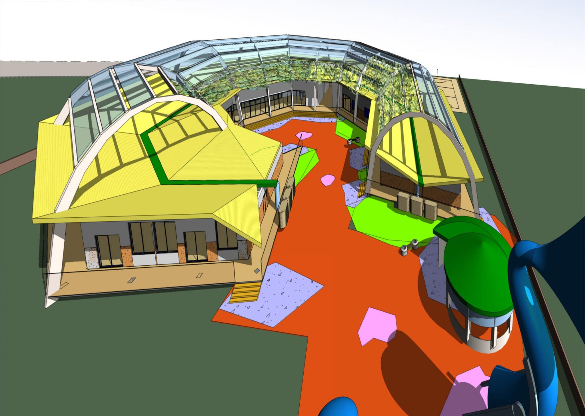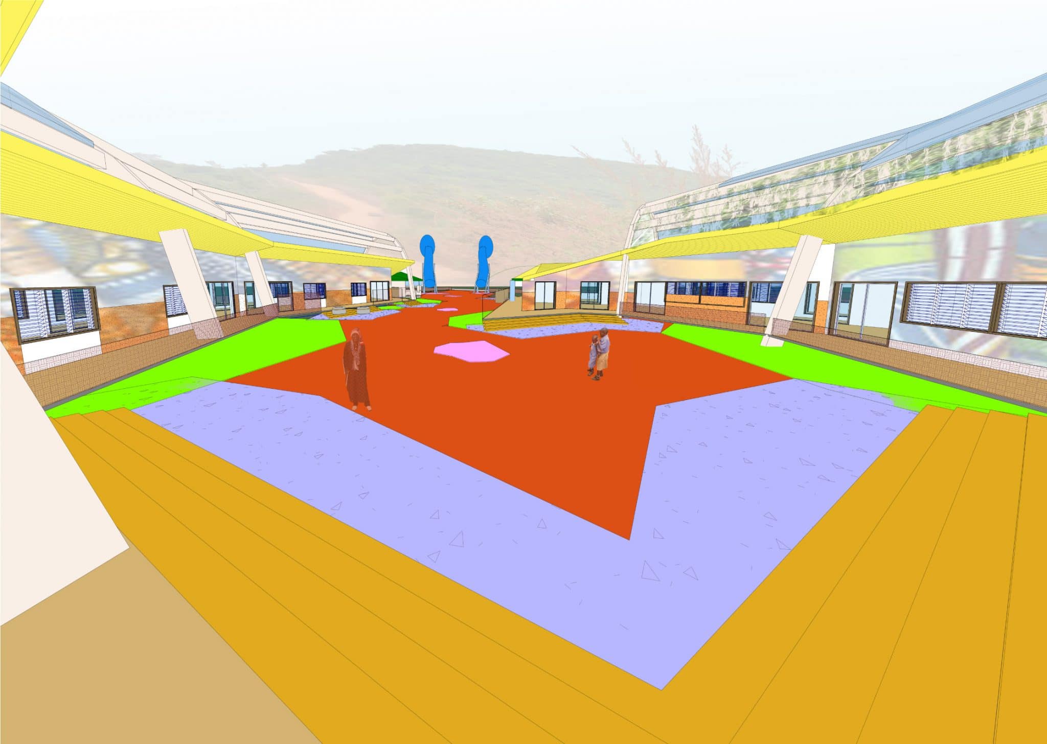 To keep the university area ventilated DesignLife has included two large funnel structure to collect cool air from a higher altitude to the ground level and the floor is raised from the ground level. Low technology wind tower to replace air conditioning with low mechanical means for improved cooling. Take a ride on the green side at the upper frame structure.